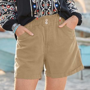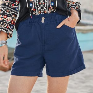 The most utilitarian shorts in your suitcase now updated for extra style. Paper-bag elastic waist. coconut buttons. zipper fly and rolled cuff hem. Cotton/linen. Machine wash. Imported. Exclusive. Sizes 0?C14. 4.5 inseam