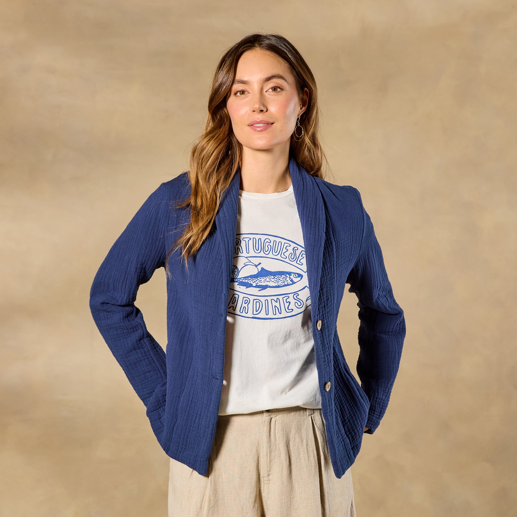 The subtle structure of a blazer PLUS the softness of four-ply brushed gauze: our Blake Blazer really is the best of both worlds. Wear with the sleeves rolled up or down; this classic-fit light layer has a shawl collar. SLASH pockets and wood buttons. CONTENT. CARE. Imported. Sizes XS (0?C2). S (4?C6). M (8?C10). L (12?C14). XL (16?C18). XXL (20?C22). Approx. 23.75l.