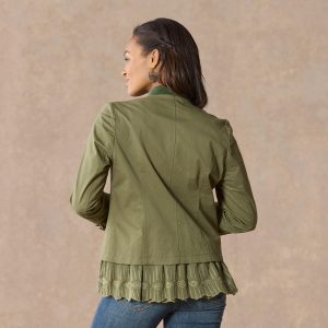 Contrasting velvet trim at the collar and welt pockets lends beauty to our fully lined jacket with ruffle and embroidery detail at the hem and sleeves. Filigree buttons. Cotton/spandex. Machine wash. Imported. Exclusive. Sizes XXS (00). XS (0?C2). S (4?C6). M (8?C10). L (12?C14). XL (16?C18). Approx. 20.5l.