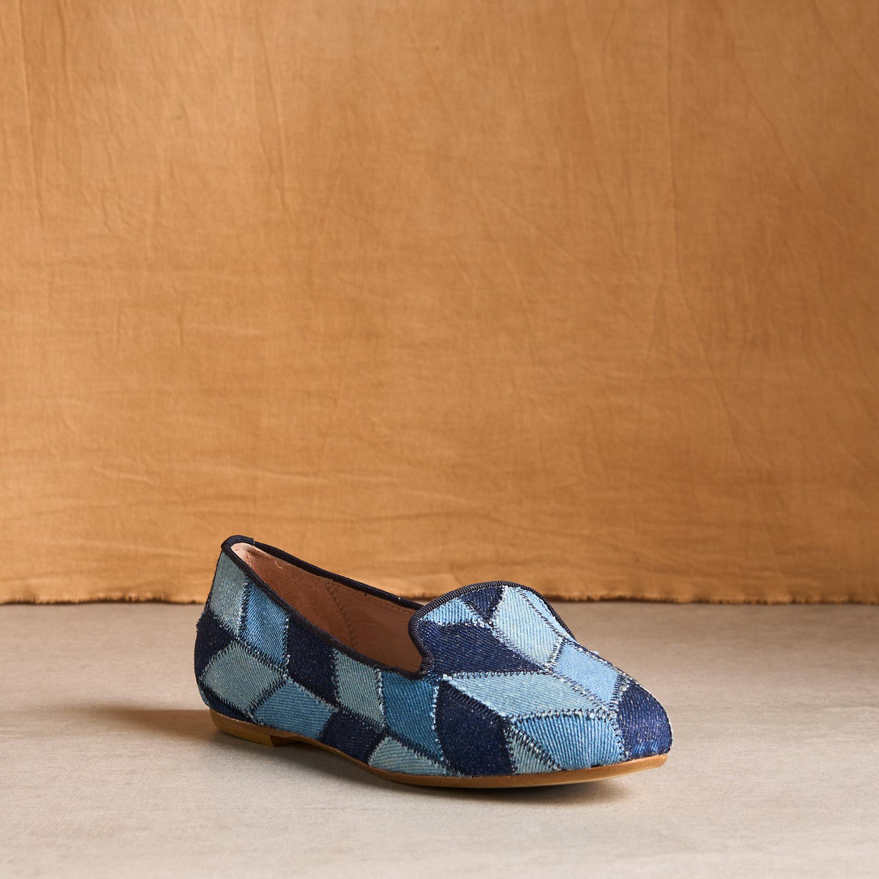 These flats feature a patchwork of different denims and are as versatile as a pair of jeans. Memory foam insole. leather lining. Cotton. Italy. Exclusive. Whole sizes 36-42. 36 (US 5.5). 37 (US 6). 38 (US 7). 39 (US 8). 40 (US 8.5). 41 (US 9.5). 42 (US 11).