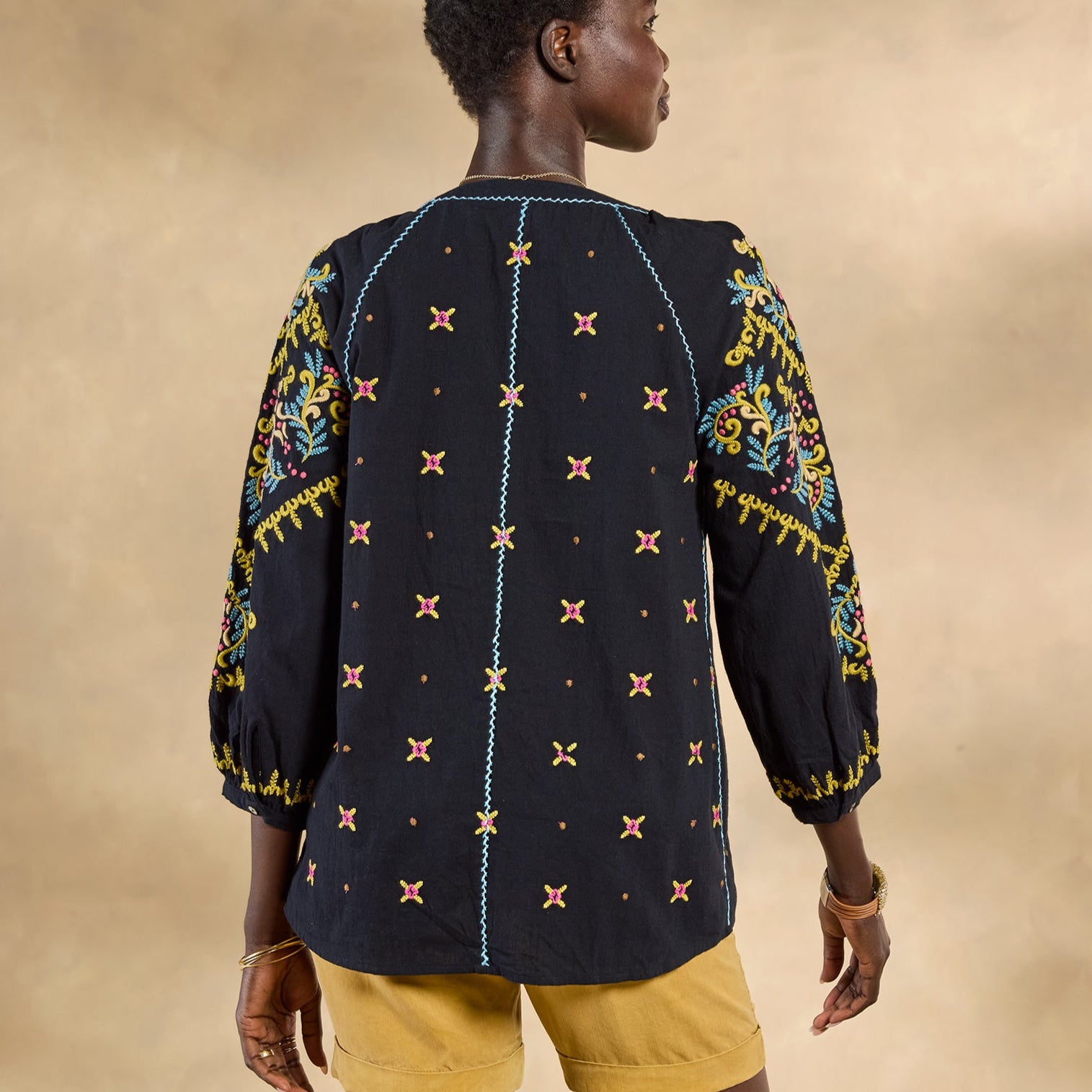 There’s joyful bohemian flair in this yarn-dyed top with luscious allover embroidery. blanket stitch details. three-quarter sleeves. shell buttons and V-neck. Full. easy fit. Cotton. Machine wash. Imported. Exclusive. Sizes XXS (00). XS (0 to 2). S (4 to 6). M (8 to 10). L (12 to 14). XL (16 to 18).Approx. 22-1/2L.