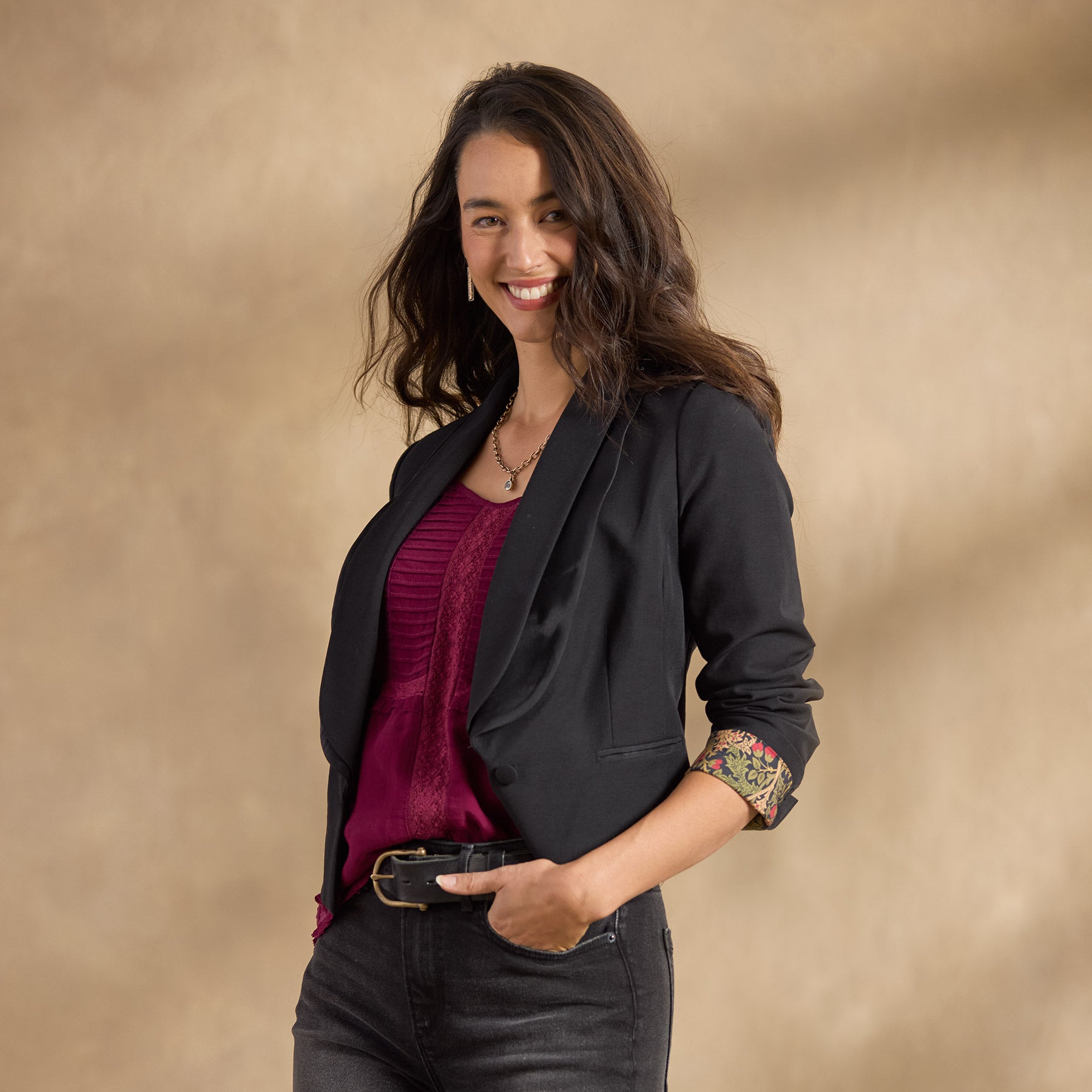 The perfect finishing touch for any holiday outfit. our Ditta Dapper Tuxedo Jacket features an elegant tailored shape with a double lapel. ultra-flattering seams. slash pockets and a contrast floral lining. Polyester/viscose/spandex/cotton. Dry clean. Imported. Exclusive. Sizes XS (0?C2). S (4?C6). M (8?C10). L (12?C14). XL (16?C18). XXL (20?C22). Approx. 21l.