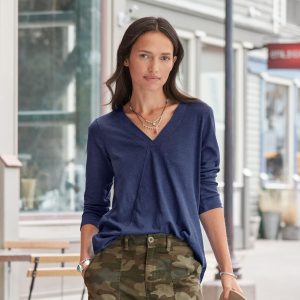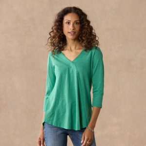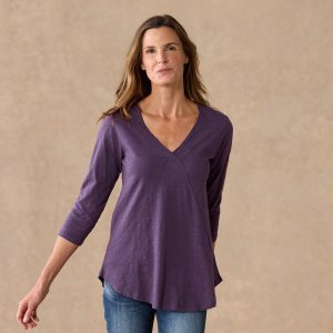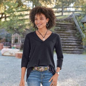 A Sundance favorite tee. now in three-quarter sleeve style. Comfy every day. this essential tee boasts subtle. directional seaming that flatters. V-neck and rounded hem. Cotton. Machine wash. Imported. Sundance exclusive. Sizes XS (0?C2). S (4?C6). M (8?C10). L (12?C14). XL (16?C18). XXL (20?C22). Approx. 29.75l.