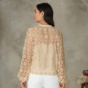 Exquisite lace is accompanied by a covered placket with buttons and scalloped trim and covered buttons on the cuffs. Cami included. Polyester. Dry clean. Imported. Sizes XS (0 to 2). S (4 to 6). M (8 to 10). L (12 to 14). XL (16 to 18). XXL (20 to 22). Approx. 24L.