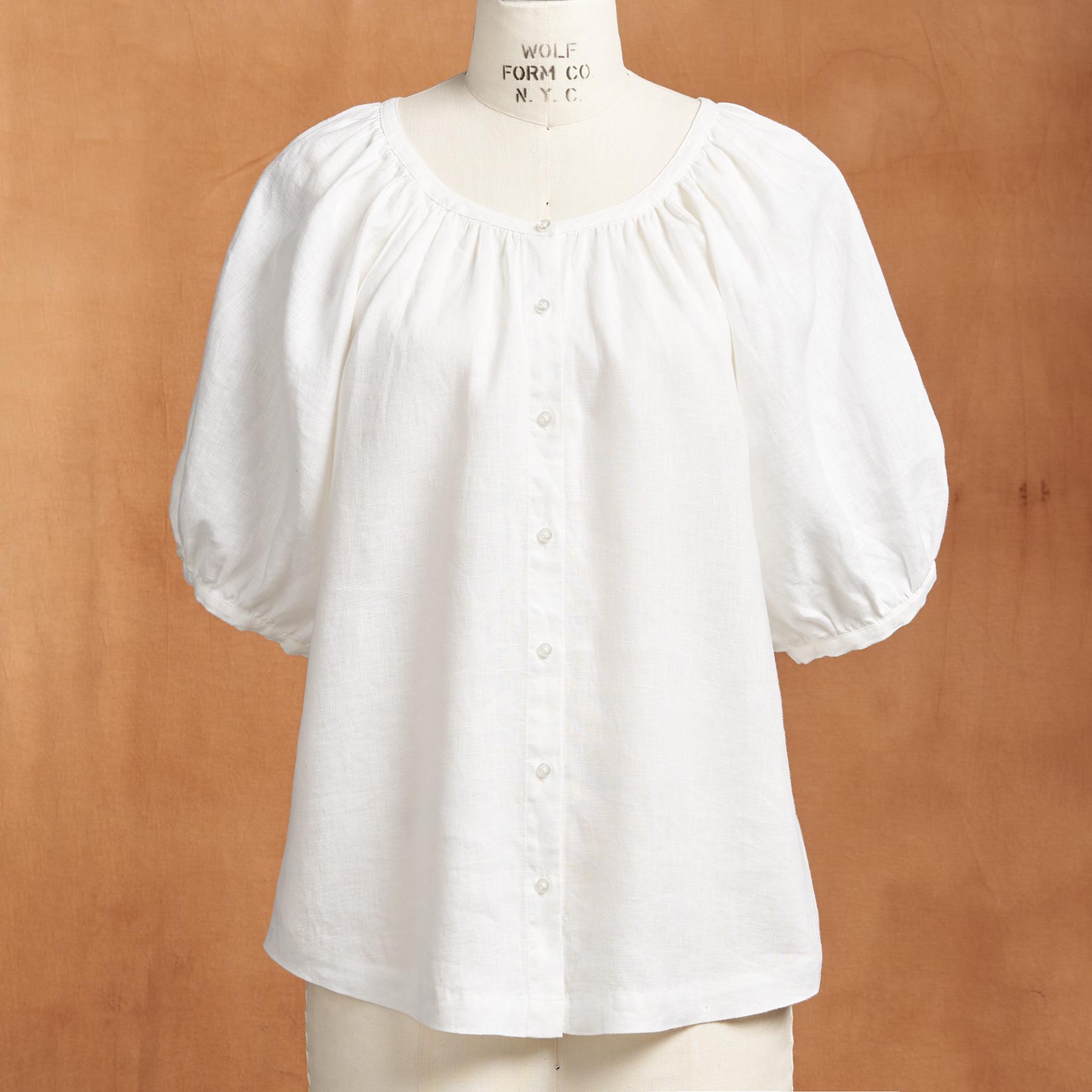 Our jewel-neck. dyed-to-match button front top is so airy and flowing. with elegant lace detail and blouson-style. elbow-length sleeves. Linen. Hand wash. Imported. Exclusive. Sizes XXS (00). XS (0-2). S (4-6). M (8-10). L (12-14). XL (16-18). Approx. 23l.