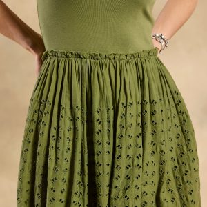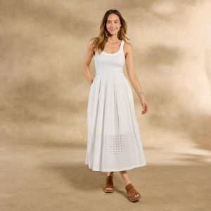 Soon to be your go-to casual fit. our easy popover tank dress is detailed with mixed rib. woven eyelet and raw edge ruffles at the waistline. Side seam pockets. lined skirt. Cotton. Machine wash. Imported. Exclusive. Sizes XXS (00). XS (0–2). S (4–6). M (8–10). L (12–14). XL (16–18). Approx. 49l.