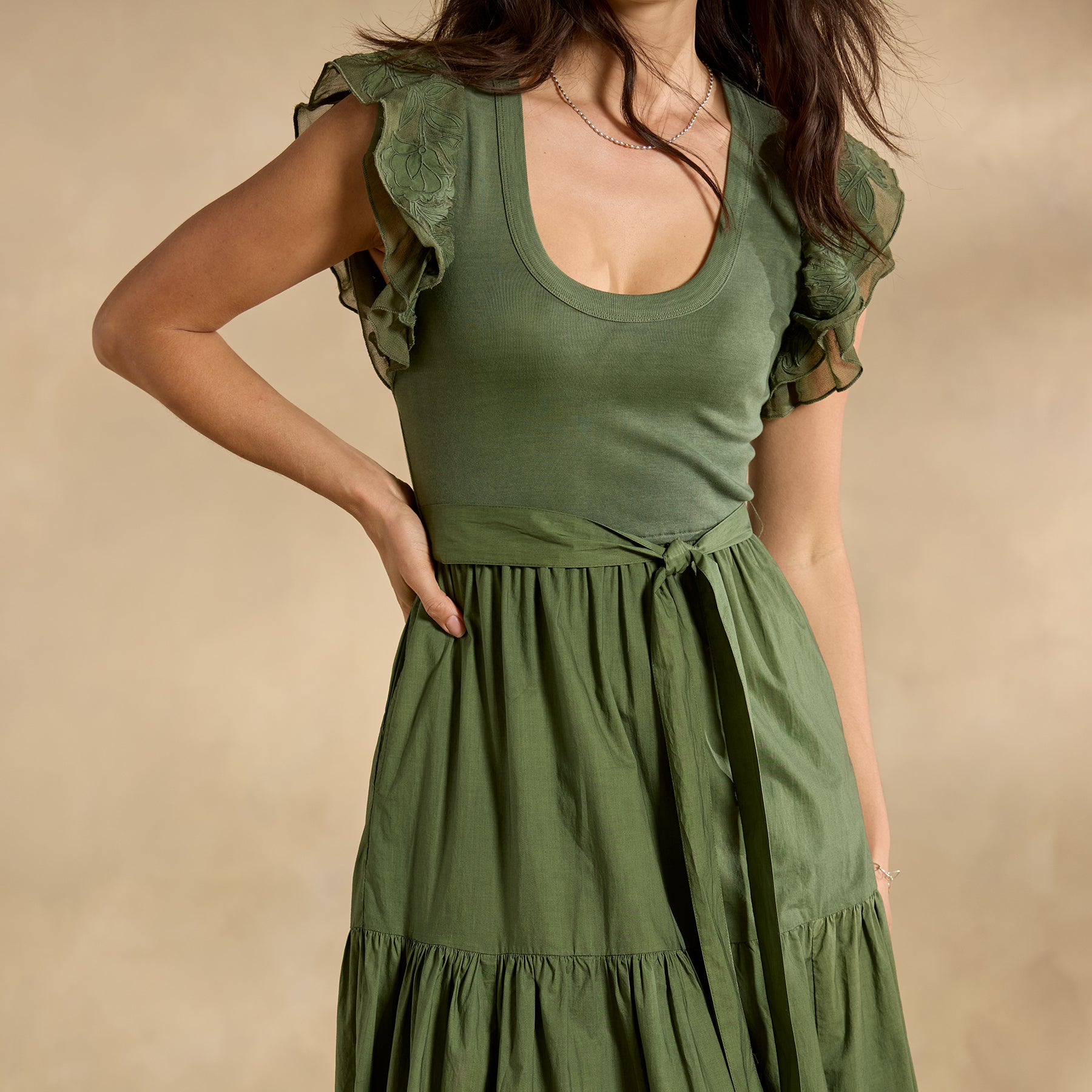 The intricate tonal detail that defines our mixed-media Madera Dress demands a closer look! With a rib-knit bodice. poplin skirt and delicate chiffon cutout details throughout??plus ruffled sleeves. scoop neck. elastic waist and lined skirt. Cotton. Machine wash. Imported. Exclusive. Sizes XXS (00). XS (0?C2). S (4?C6). M (8?C10). L (12?C14). XL (16?C18). Approx. 46l.