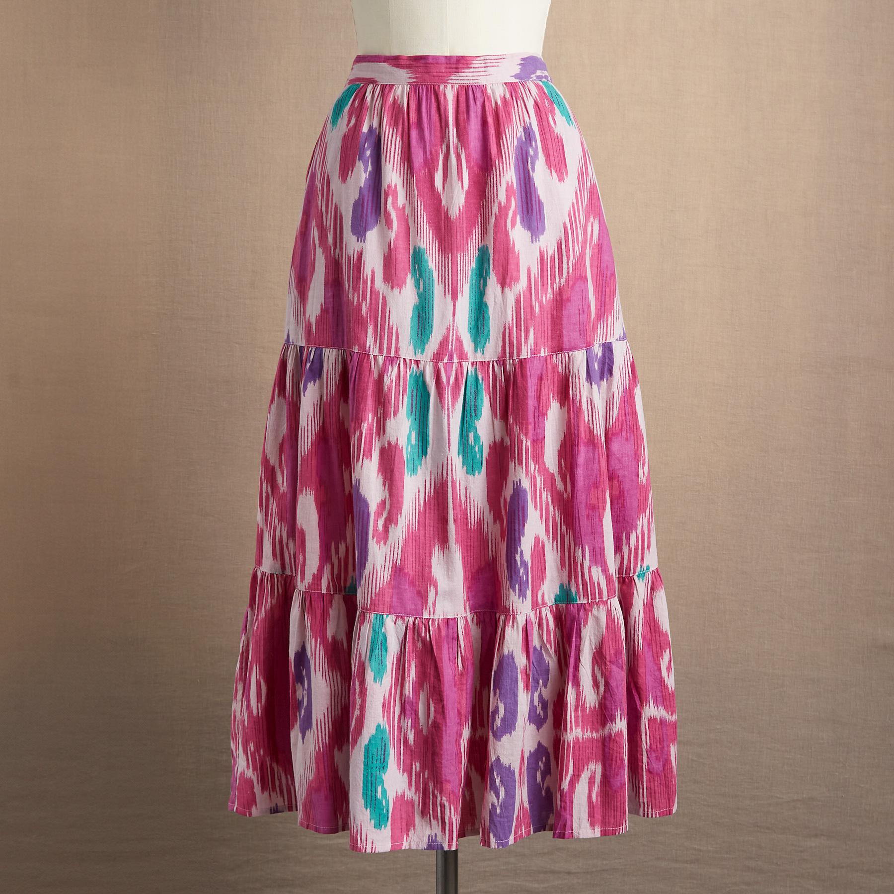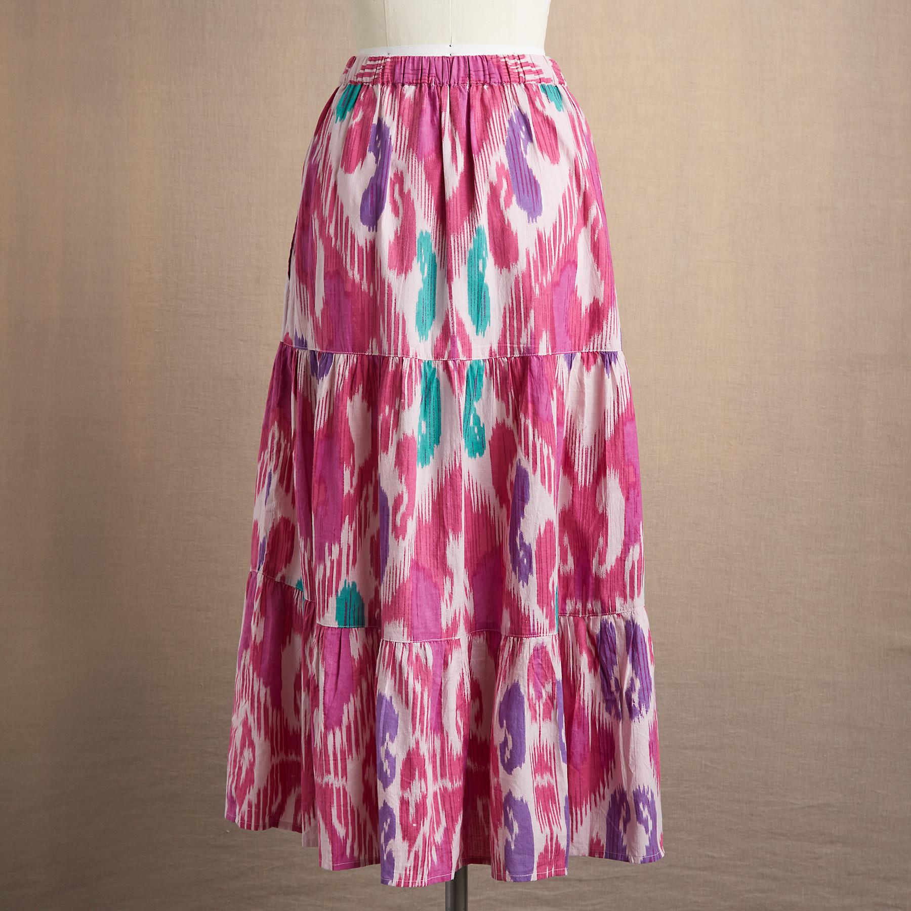 A vibrant ikat print makes a beautiful statement on this easy. tiered midi skirt. Pull-on styling with elastic back waist and on-seam pockets. Cotton. Machine wash. Imported. Sizes XS (4). S (6). M (8?C10). L (12). XL (14). XXL (16). Approx. 34 inseam.