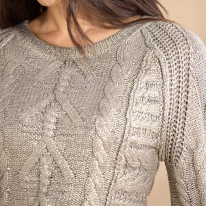 Our foil print crewneck sweater exudes a slight shimmer that is so festive. In a chunky cable mix. with exposed seam details. jersey roll at cuffs and rib trim. Cotton/nylon/merino wool. Hand wash. Imported. Exclusive. Sizes XS (0–2). S (4–6). M (8–10). L (12–14). XL (16–18). XXL (20–22). Approx. 22l.