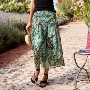 Earthy. swingy. rainforest-inspired skirt. Cotton. Dry clean. Imported. Sizes 0?C14. Approx. 35.25l.