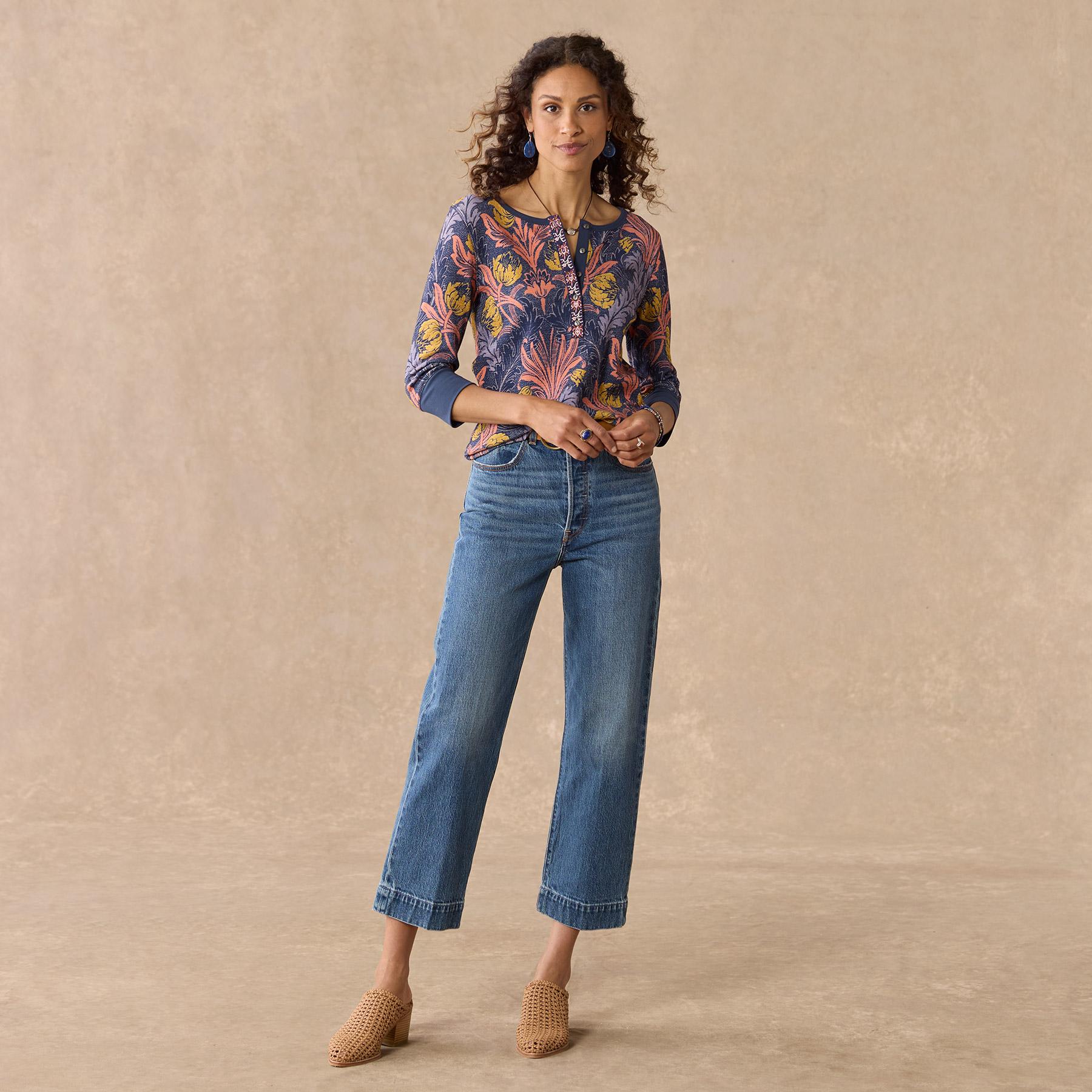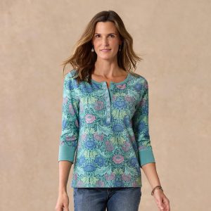 Our thermal henley in an oversized placed floral print is so lovely with embroidery at the placket. metal buttons and contrast twill tape details. Cotton/spandex. Machine wash. Imported. Exclusive. Sizes XXS (00). XS (0?C2). S (4?C6). M (8?C10). L (12?C14). XL (16?C18). Approx. 23.5l.