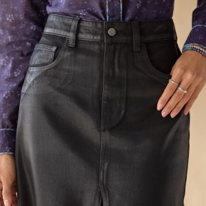 Our stylish oh so easy to wear coated denim skirt takes a classic look and adds a special touch with five pockets. button and zip fly closure and a sophisticated center front slit. Cotton/lycra. Machine wash. Imported. Exclusive. Sizes 24–32. Approx. 31l.