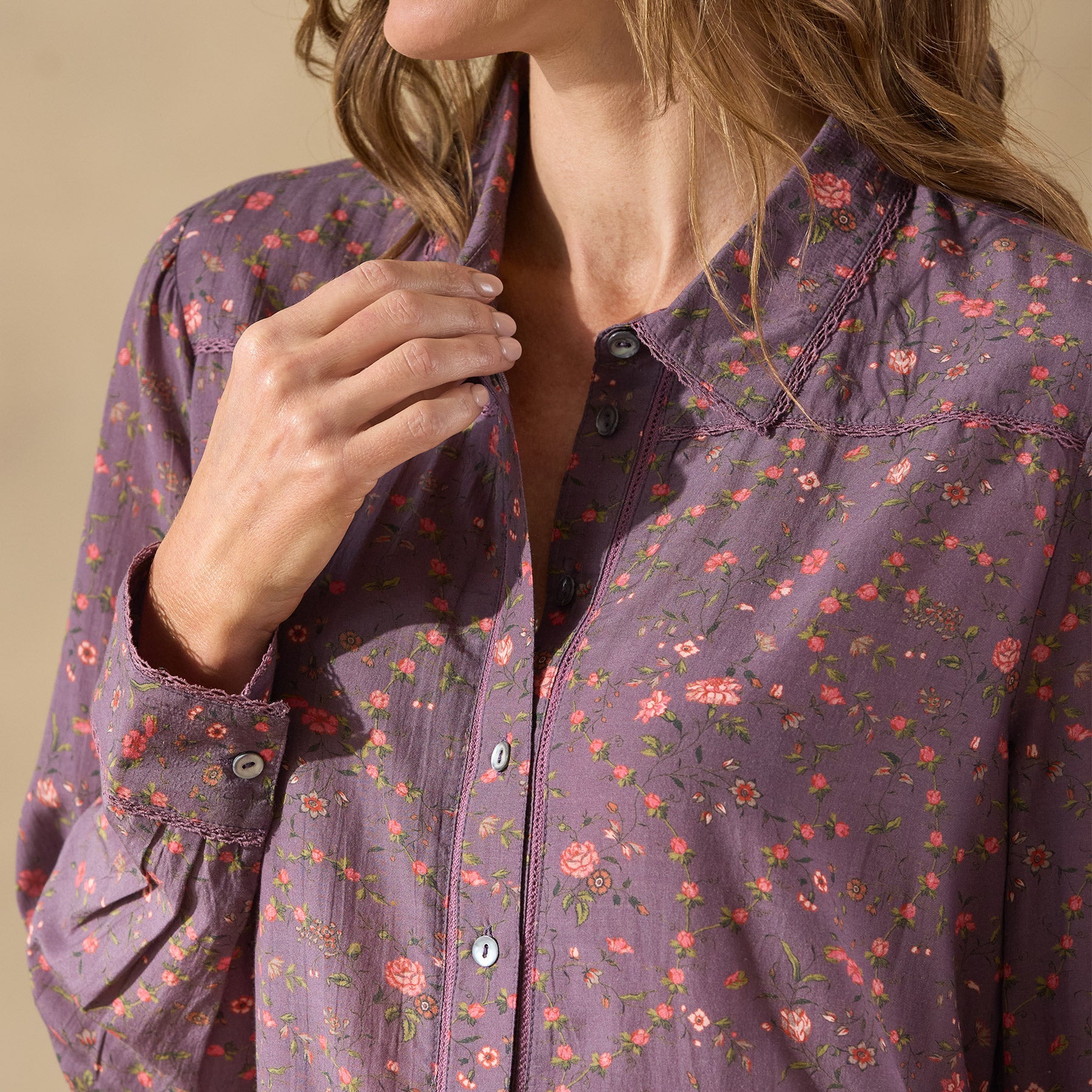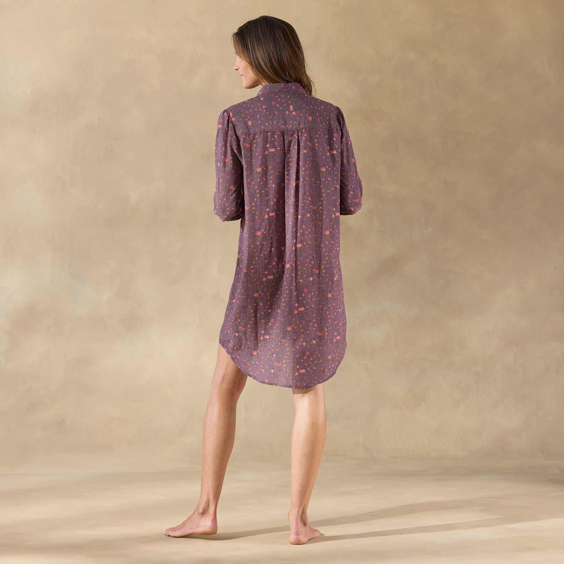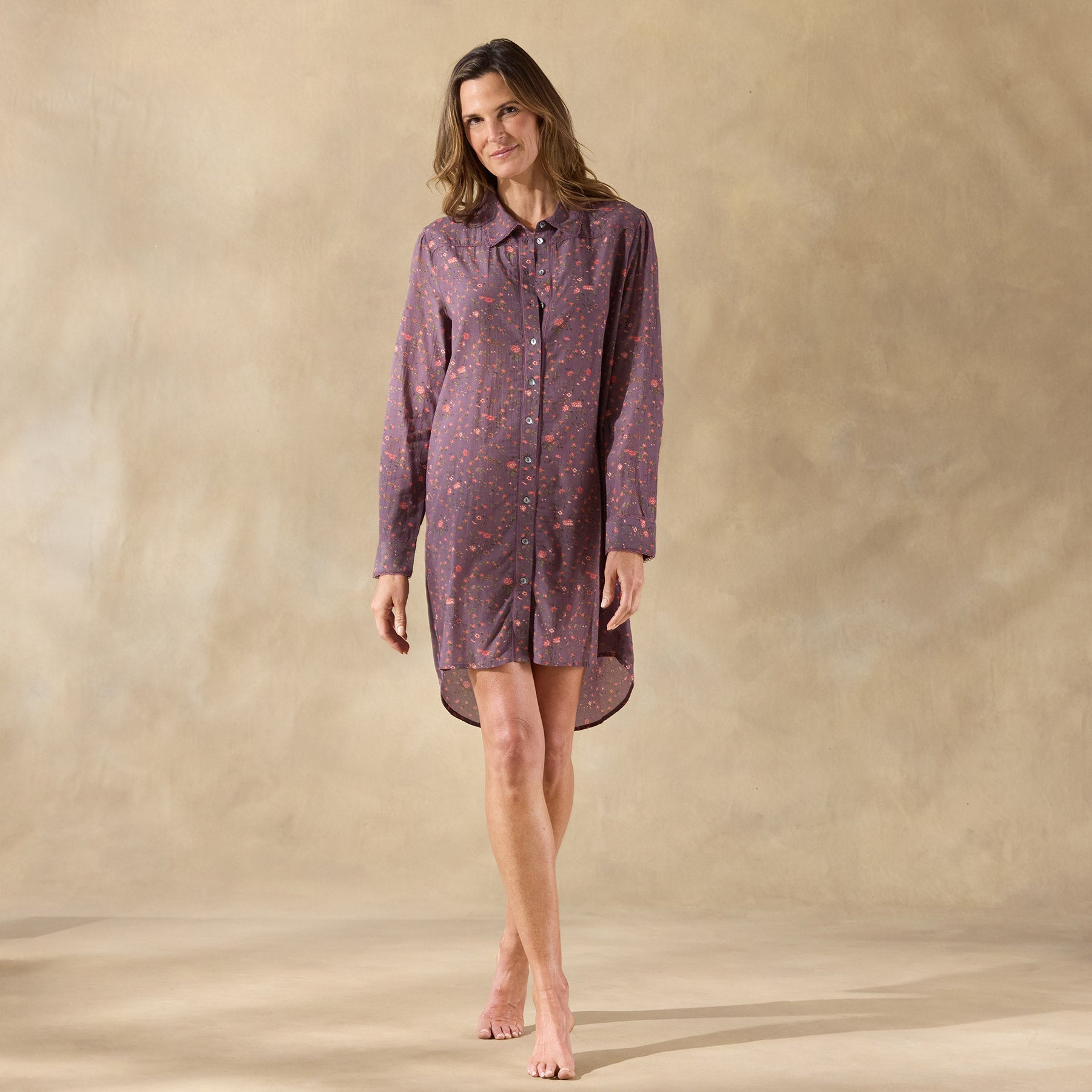 The dreamiest ditsy floral sleep dress. super lightweight. with popover styling. smoked shell button front and tiny lace detail at placket. yoke and collar. One-button cuffs. front and back yoke and box pleat at back. Cotton/viscose voile. Machine wash. Imported. Exclusive. Sizes XS (0?C2). S (4?C6). M (8?C10). L (12?C14). XL (16?C18). XXL (20?C22). Approx. 35.5l.