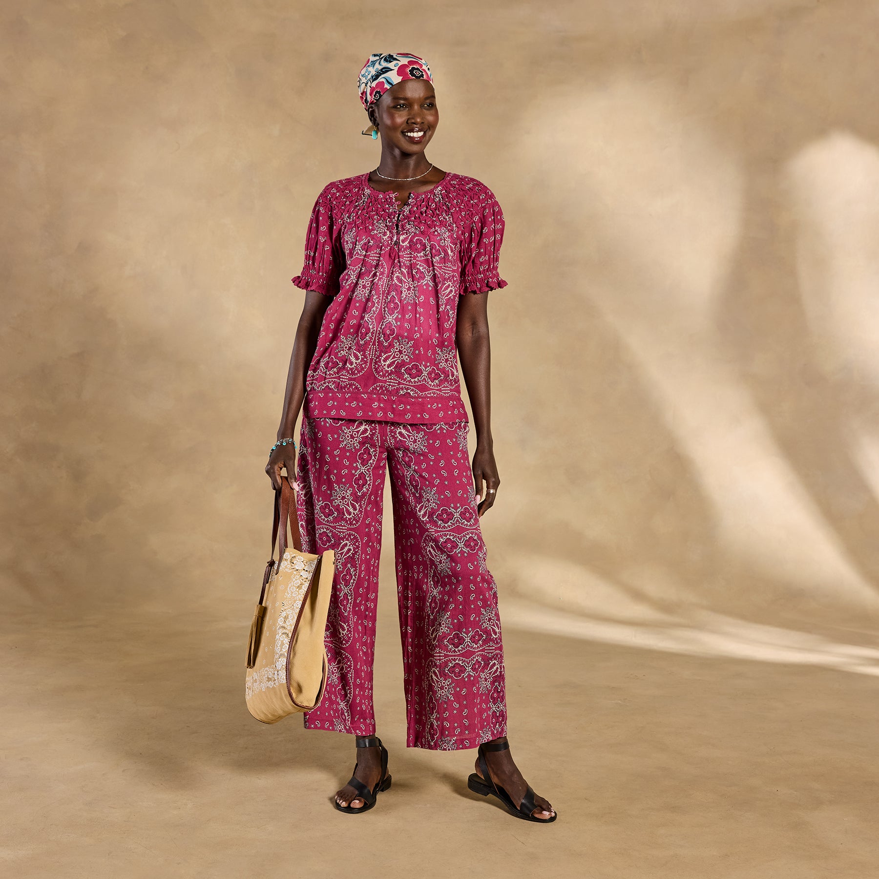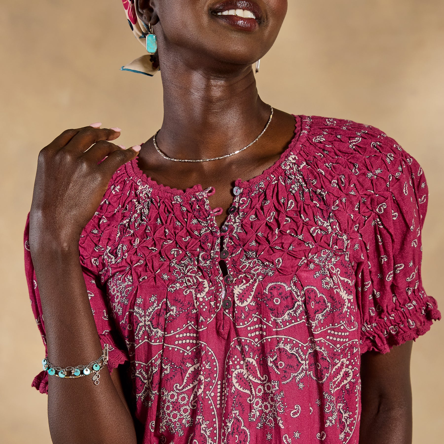Feminine textures like pineapple smocking and lace accents combine with bold printed details on our feminine Woodrose Top. Button placket with loop closure. elastic cuffs. Cotton. Machine wash. Imported. Exclusive. Sizes XS (0–2). S (4–6). M (8–10). L (12–14). XL (16–18). XXL (20–22). Approx. 24.5l.